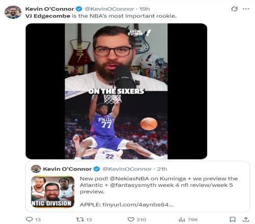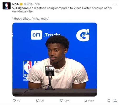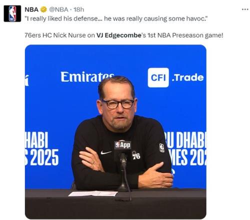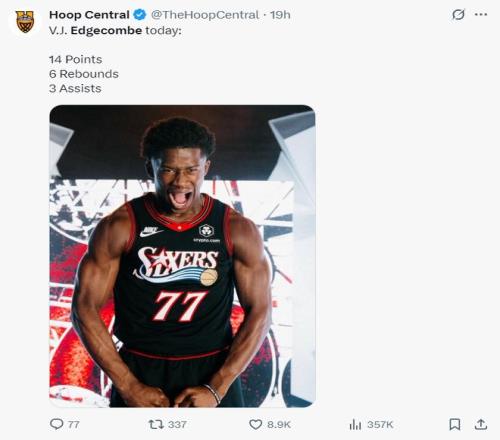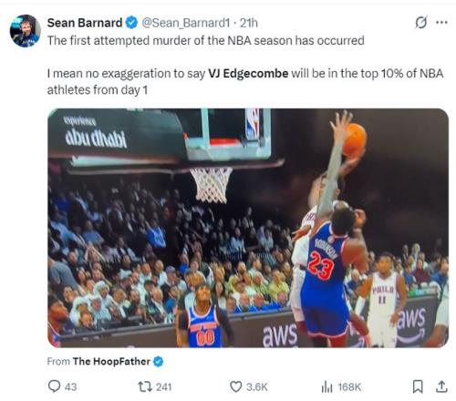 费城记者Sean Barnard写道:NBA新赛季的第一场比赛就险些出现了逆天隔扣,我毫不夸张的说,埃奇库姆会成为NBA天赋排名前10%的球员。