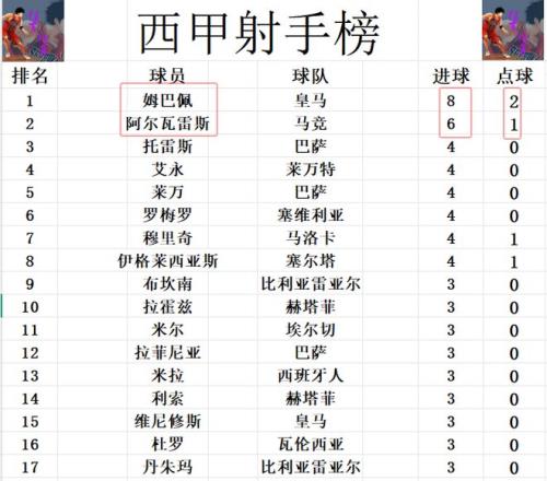 射手榜方面,姆巴佩8球继续领跑,阿尔瓦雷斯2球之差紧随其后。托雷斯,莱万,穆里奇,罗梅罗等人4球并列第3。维尼修斯,居莱尔,拉菲尼亚,米尔等人3球刚好挤入前十。马拉约尔今天打入一球,但还差1球才能进前十。