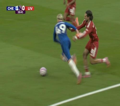 比赛第39分钟,加纳乔在索博斯洛伊的防守下倒在禁区内,主裁判安东尼-泰勒没有判罚点球,并向对判罚表达异议的切尔西主帅马雷斯卡出示黄牌。