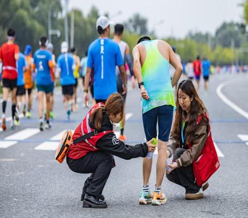 医护人员在为跑者紧急治疗。新京报记者 浦峰 摄