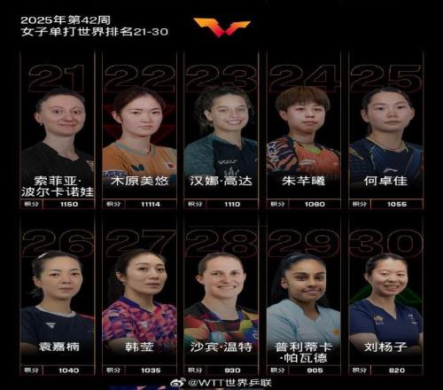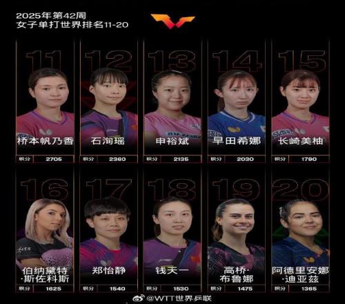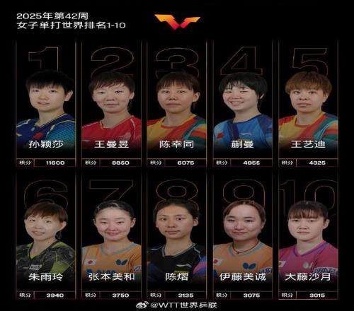 女子单打方面,中国队球员孙颖莎、王曼昱、陈幸同、蒯曼、王艺迪位列前五,陈熠上升1个名次位列第八。