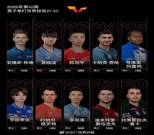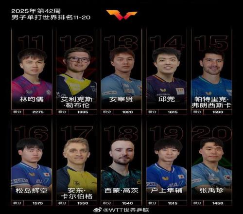 男子单打方面,中国队球员王楚钦、林诗栋位列前二,梁靖崑位列第七,向鹏位列第九。户上隼辅排名上升1个名次位列第19;张禹珍排名上升1个名次位列第20。
