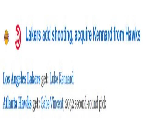 北京时间2月6日,在NBA的交易截止日,湖人完成了一笔2换1的交易,送出文森特和一个2032年的次轮签,从老鹰得到神射手肯纳德。随后ESPN对这笔交易进行评级——